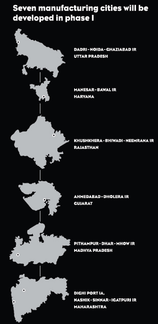 The plan is to develop new manufacturing cities, logistical hubs and residential townships along the 1500 km stretch. Incorporating the philosophy of sustainability and development, each manufacturing city will boast of world – class infrastructure, convenient public transport, power management and an efficient water and waste management system. Once completed, these nodal towns will ease the pressure on the burgeoning cities and will be the hallmark of a resurgent India.
